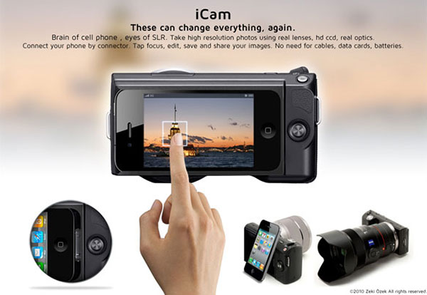 Практически все современные мобильники поставляются сегодня со встроенными камерами, это достаточно полезная функция, хотя в реальности фотографии на телефонах получаются весьма посредственного качества, и увеличение мегапикселей никак не влияет на эту ситуацию. Неудивительно, что современные профессионалы и фотолюбители выбирают фотоаппараты, а не телефоны, хотя функциональность последних ушла далеко вперед. Выход предложил турецкий дизайнер Зеки Озек (Zeki Ozek), разработавший концепт кейса iCam. Внешний вид устройства напоминает классическую фотокамеру зеркального типа, на задней панели которой располагается крэдл для iPhone. Смартфон размещается в пазу кейса и подключается к нему посредством стандартного 30-контактного разъема. Эта камера позволяет пользоваться настоящими полнораз...